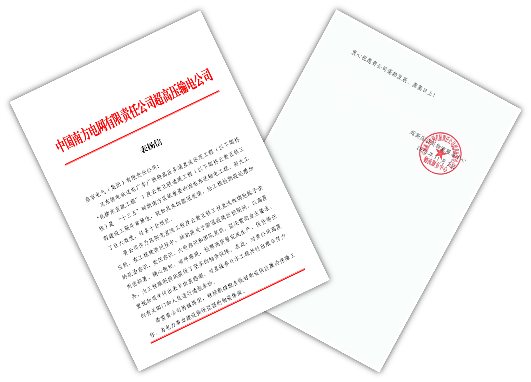 南網(wǎng)超高壓公司向南京電氣致表揚信