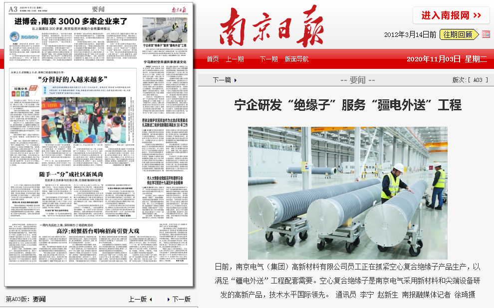 10月28日和11月3日,南報融媒旗下的紫金山新聞客戶端和南京市委黨報《南京日報》分別對南京電氣研發(fā)生產(chǎn)空心復合絕緣子新產(chǎn)品、服務(wù)國家重點工程做了報道。 10月28日,“紫金山新聞”發(fā)布消息《南京電氣研...